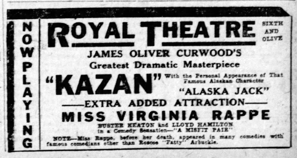 As it turned out, Rappe’s death and the charge of murder being brought against Arbuckle by Maude Delmont and San Francisco District Attorney Matthew Brady, offered theater managers the opportunity to fill seats with those curious to see Virginia Rappe on screen. Across a broad swath of the country’s midsection, from St. Louis to Salt Lake City, Rappe’s name appeared prominently in newspaper advertisements. In St. Louis, the Royal Theatre not only listed A Misfit Pair as an “Extra Added Attraction” starring Virginia Rappe, but added that Lloyd Hamilton, Rappe’s co-star in Henry Lehrman’s A Twilight Baby (1919), starred as well as —impossibly? in cameo?—Buster Keaton.[2]