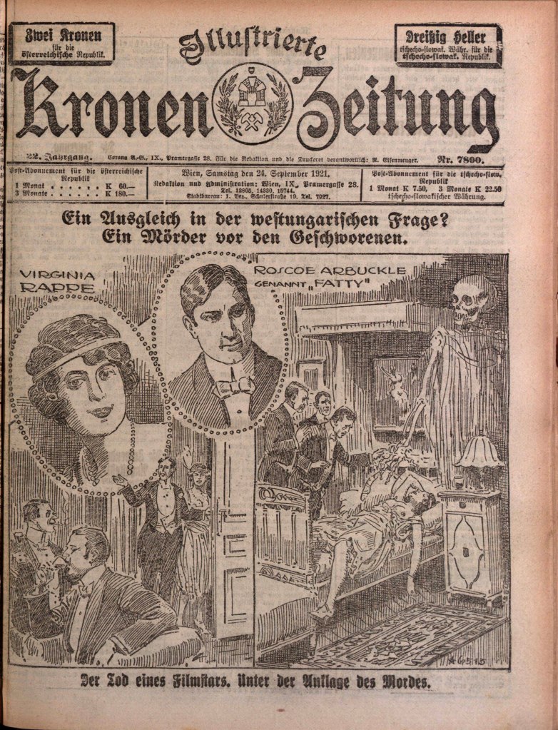 Although Roscoe Arbuckle was well known in England and France, his appearance was evidently a mystery to the editor of the Illustrierte Kronen Zeitung, a tabloid in the Austrian capital of Vienna. Despite lacking visual references for Arbuckle and Virginia Rappe, the cover artist used his imagination and wire service reports to recreate the scene in room 1219 of the St. Francis Hotel on September 5, 1921.