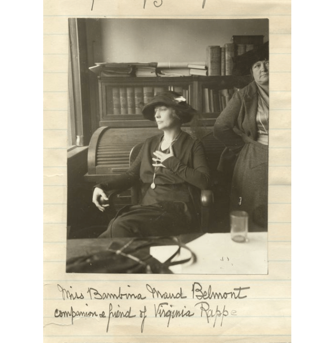 In the above photo we see Delmont, presumably in the office of District Attorney Matthew Brady or the Detective Bureau.. She is in a black outfit, worn in mourning for Rappe, as described by reporters. There are also details that suggest this image, with the water glass and the police matron, was taken before her testimony. This testimony would be the only time she faced Arbuckle in a courtroom setting. While on the stand Delmont asked for warm water and a coffee cupful was procured, thus delaying the proceedings. The image below, from the Daily News, credited Underwood, has a coffee cup near Delmont’s left hand. Apparently, she brought the cup back with her to this office setting afterward.