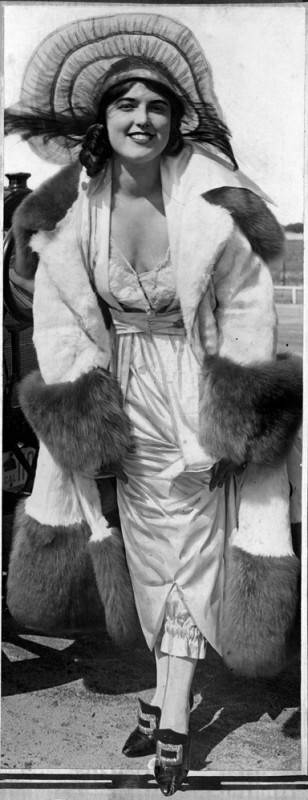 On closer inspection of the original photograph, one can better see the enormous radiator of an automobile behind her and the fencing of a racetrack. These features, the dated outfit and millinery, suggest an earlier date. One can also see some of the California license plate in the lower left. This plate design first appeared in 1916—the year Rappe arrived in Los Angeles and appeared in the Memorial Day fashion show and “race” at Ascot Speedway, where she drove Henry Lehrman’s FIAT. By 1921, the California plate had been redesigned.