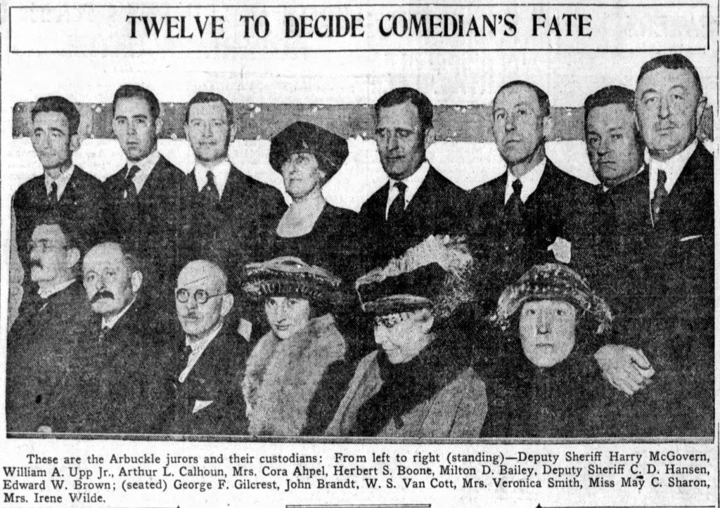 On St. Patrick’s Day 1922, eight men and four women—plus two alternates—were sworn in to judge whether Roscoe Arbuckle was guilty or innocent of the manslaughter death of Virginia Rappe. Fifty-one prospective jurors had been interrogated by prosecutors and defense lawyers for biases, either pro or con, as well as evidence of the kind of celebrity fanaticism that neither side would have wanted. It would have been nearly impossible for anyone in the Bay area to have been unaware of the previous two trials though many would protest that they had not been influenced by news coverage.