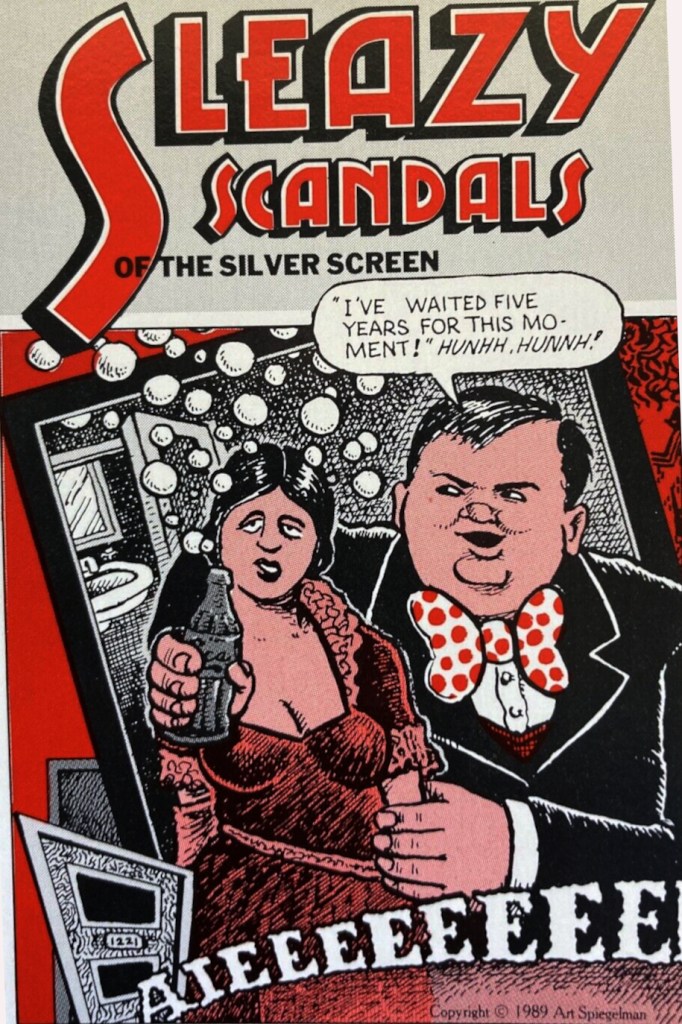 An outlier among these cultural artifacts—for they aren’t really scholarly endeavors—is Art Spiegelman’s contribution to Sleazy Scandals of the Silver Screen #1, published by the San Francisco: Cartoonists Co-op Press in 1974. Best known for his graphic nonfiction novel Maus and its sequels, Spiegelman is intuitive in his rendering of the Arbuckle case, titled “Fatty’s Fatal Fling,” with just a few pages and panels. Much as he enacts a certain poetic justice on Nazi Germany for the Holocaust by depicting persecuted Jews and their survivors as mice and the Germans as cats, Spiegelman does so on Roscoe Arbuckle as karma.