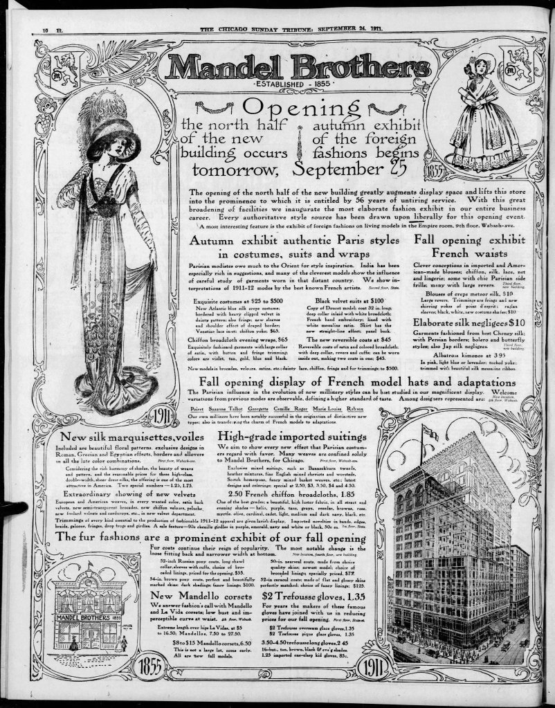 Full-page ad for Mandel Brothers, September 1911 (Newspapers.com)