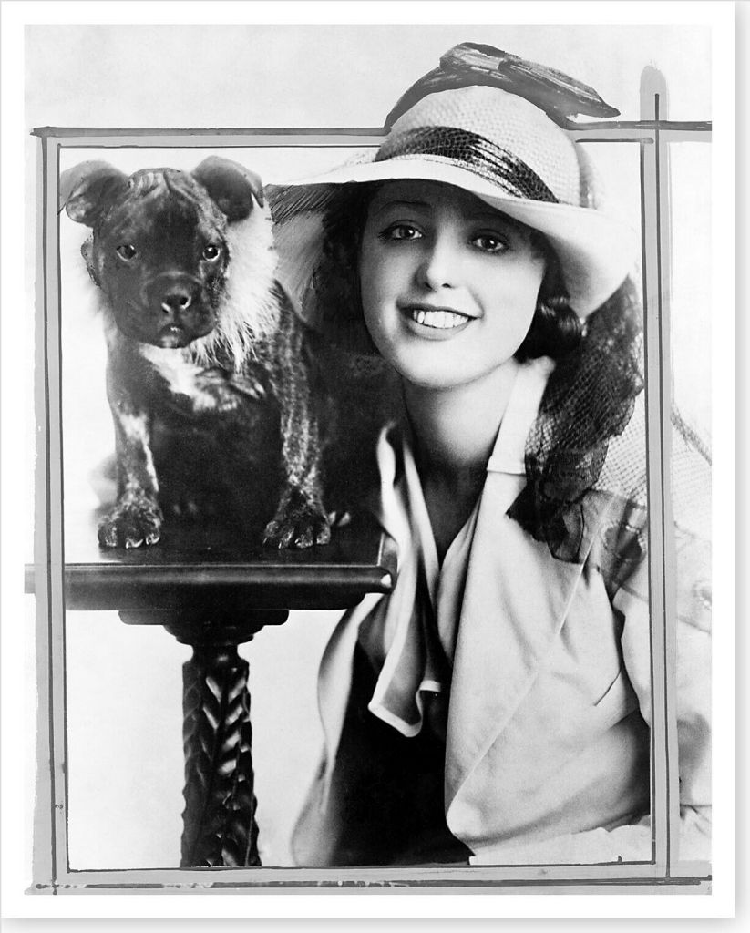 “Jeff,” Virginia Rappe’s brindle bull terrier pup, and Rappe wearing an outfit similar to the one she wore on September 5, 1921 (Library of Congress)