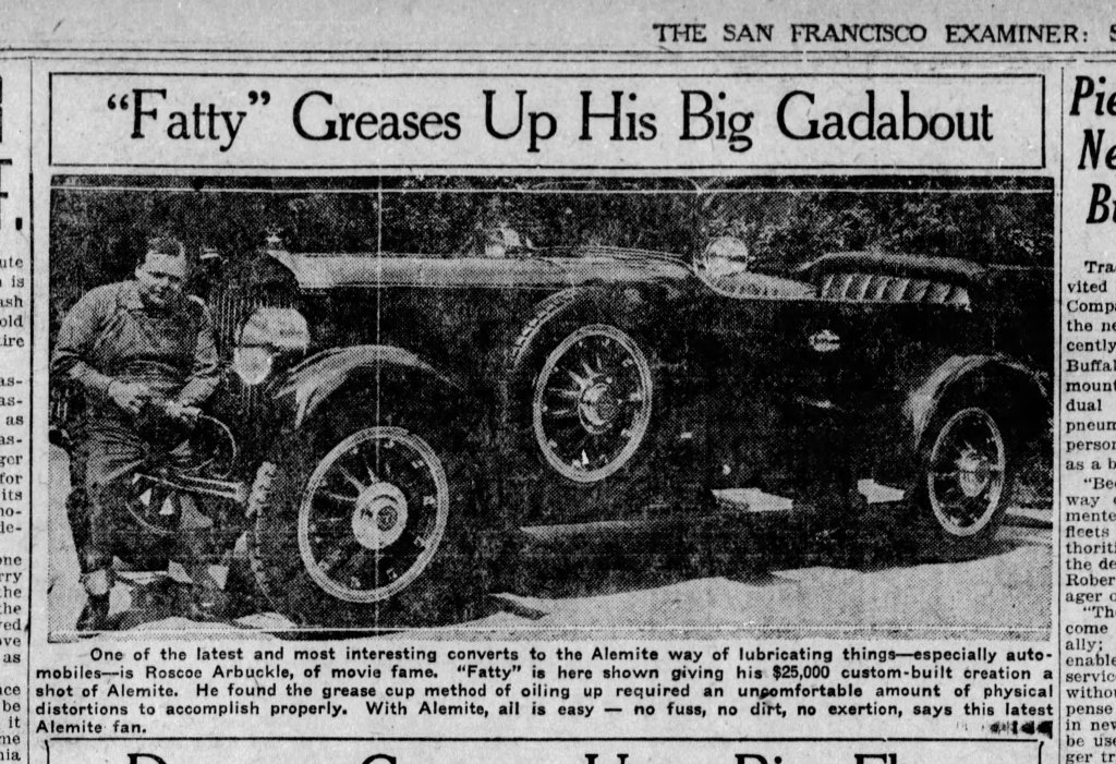 Roscoe Arbuckle using a grease gun on his Pierce-Arrow, ca. late 1920 (Newspapers.com)