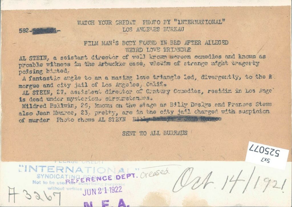 In the end, Stein’s roommates were only charged with “vagrancy” and released. Fishback made the funeral arrangements and the case quickly faded before Matthew Brady arrived to conduct his “open house” in Los Angeles. There was no curiosity on his part. His deputy, Milton U’Ren, only said that Stein didn’t “figure in any important connection in the case against Roscoe Arbuckle”—nor could he address why Stein had in his possession a telegram intended for Ira Fortlouis.