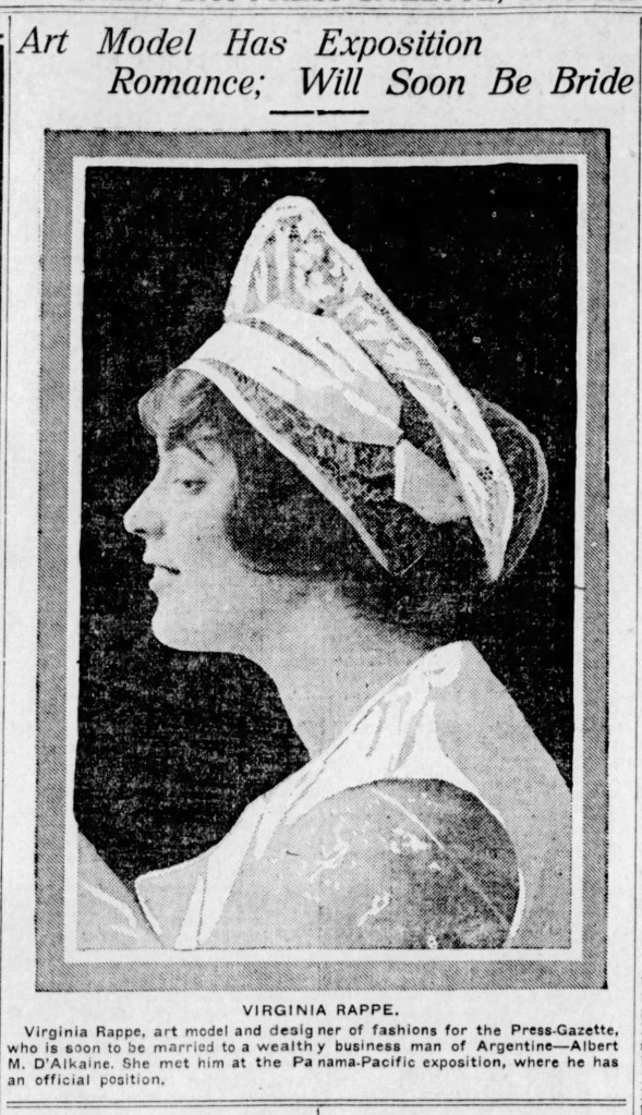 One image from the pajama shoot was published in another time and context: when Rappe was rumored to be engaged to an Argentine diplomat attached to his country’s pavilion during the 1915 Panama–Pacific International Exposition in San Francisco. Indeed, it is likely that the outfit she’s wearing was also modeled at the exposition (The wire service image was distributed with the caption, save for where the editor could insert the name of his respective newspaper to make it seem as though Rappe was an in-house fashion designer. She was independent.)