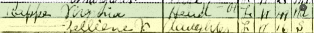 There is an entry for a Mabel Rapp in Chicago in the 1880 census.[4] There are two entries for Virginia Rappe in the U.S. Census: 1910 and 1920. The 1910 entry was likely filled out by the person indicated as the head of household, the putative grandmother. As for her, she entered herself as a forty-nine-year-old widow named Virginia Rappe![5] She entered who we know as Virginia Rappe as a daughter but using the name Zelliene V. Rappe, aged 16.[6]