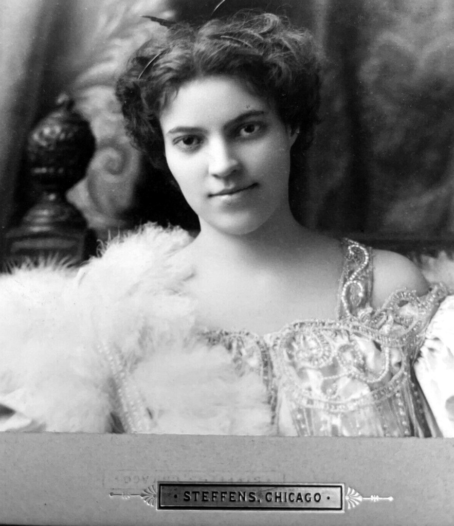 We know that she posed for the Chicago photographer Matthew “Commodore” Steffens during the 1890s, around the time of the Columbian Exposition of 1893. He used cabinet cards with her photo, which he displayed in his studio window, as samples of his talent—and her beauty.